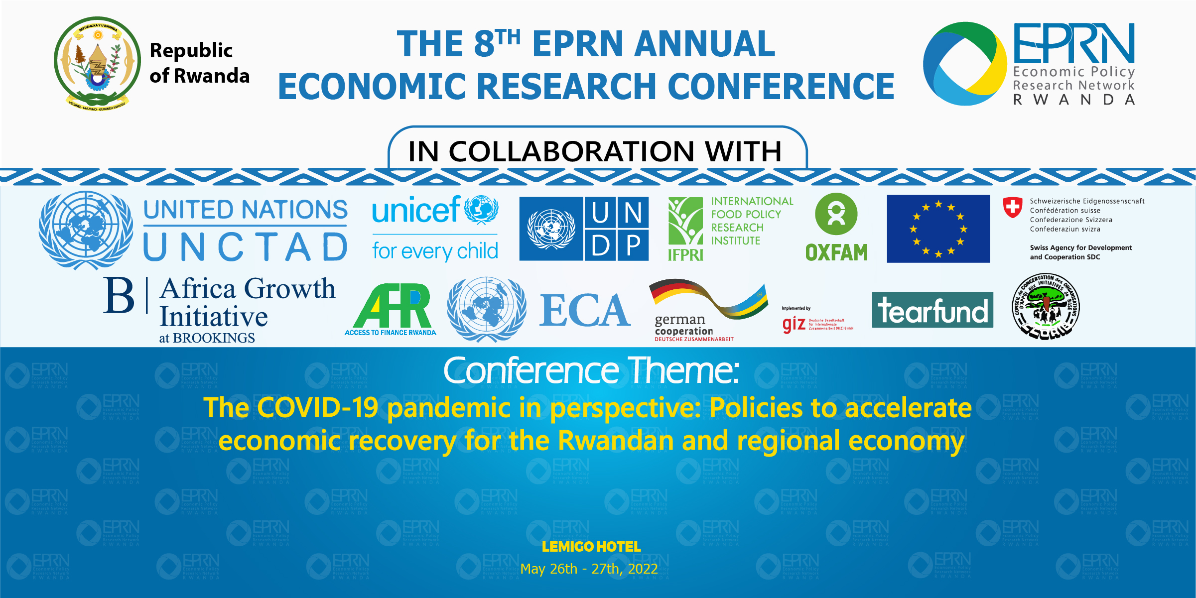 The Economic Policy Research Network (EPRN) and its partners wish to encourage research that assesses the impacts of the COVID-19 pandemic and subsequent recovery measures across various economic sectors and populations to provide a deeper and more nuanced understanding of the crisis. Research findings will be discussed in an 8th Research Conference scheduled for May 2022, with an overall objective of recommending specific short-term, medium-term, and long-term economic policy options to advance a new and inclusive path to recovery and growth Rwanda and the region.